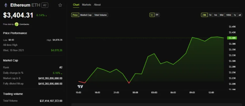 根据BeInCrypto数据,截至发稿时,ETH的交易价格为3,404美元,自周五开盘以来上涨了6%以上。
