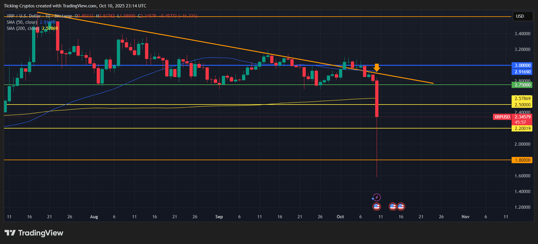 图表显示暴跌前价格在3.00美元附近遭遇下降趋势线压制,确认了空头动能。这是XRP自2024年初以来的最大单日跌幅,长期均线系统的失守预示若市场情绪持续恶化,下行空间可能进一步打开。
