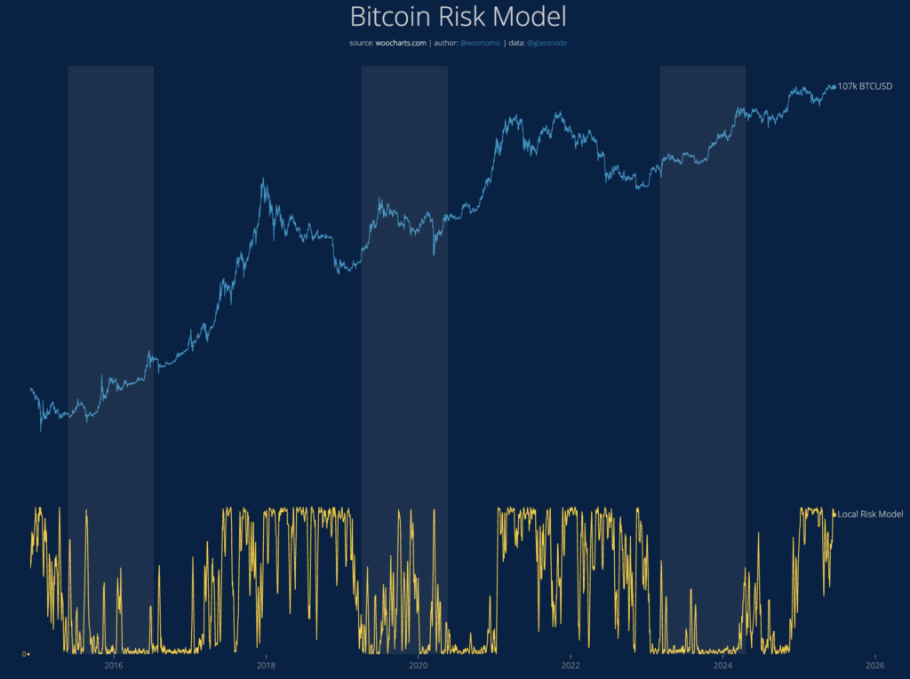 知名分析师Willy Woo指出,风险模型显示比特币价格已进入牛市后期阶段。该模型通过BTC流动性下降进行测算。但他仍预期价格存在上行空间,并强调全球宏观市场转向时才会迎来熊市。