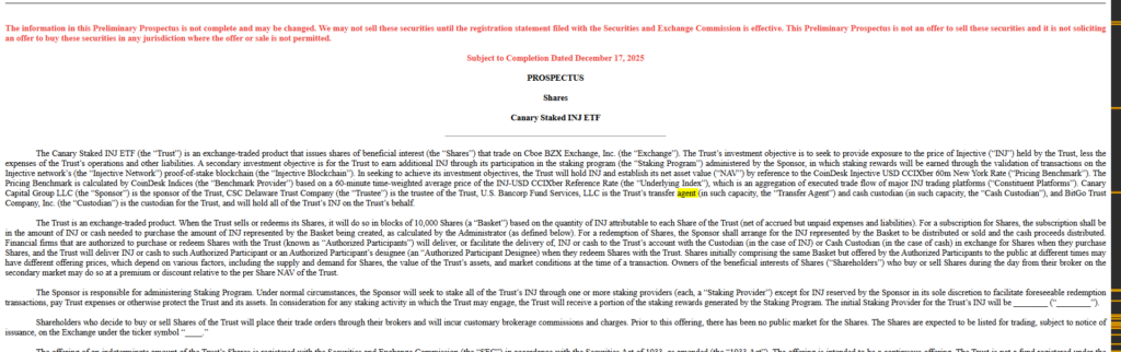 BitGo将担任该交易所交易基金的托管人,美国银行基金服务公司则被指定为管理人、转让代理及现金托管方。虽然未明确staking服务提供商,但该ETF计划通过一家或多家的机构质押全部INJ资产。