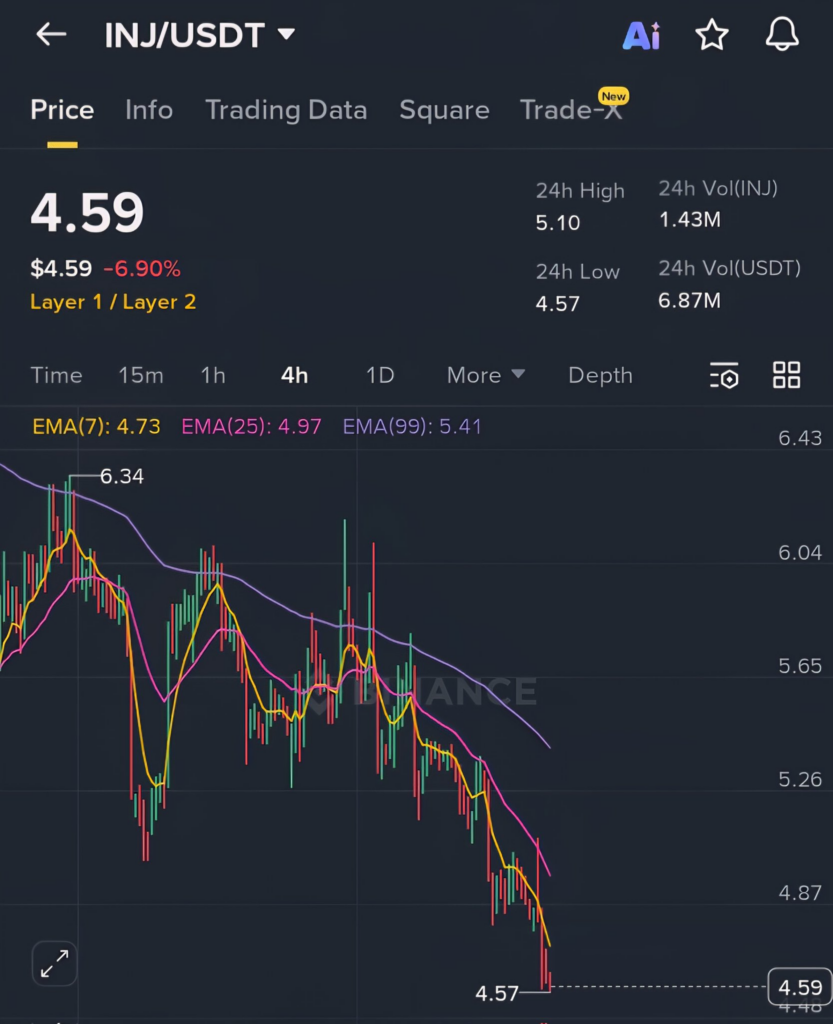 INJ价格在过去几小时小幅回升,但24小时内仍下跌超5%。截至撰稿时,交易价格为4.57美元,24小时波动区间为4.54-5.08美元。近期交易量亦出现小幅攀升。