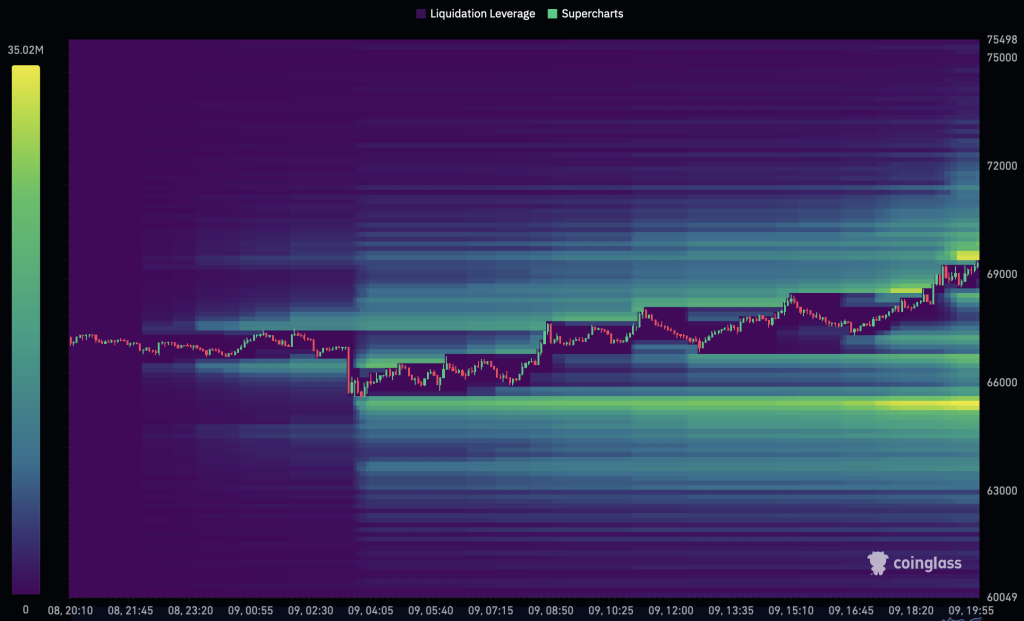 若比特币价格成功收复7万美元关口,可能引发市场强劲波动。上文提及的Coinglass清算数据显示,该价位上方存在显著的空头清算聚集区,这意味着一旦突破,大量看跌交易者将被迫平仓。