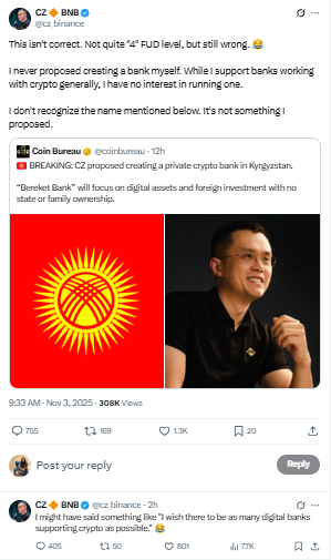 币安联合创始人赵长鹏否认在吉尔吉斯斯坦筹建私人加密银行