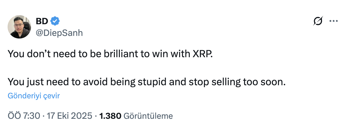 Diep Sanh主张明确的投资理念:XRP的成功并不需要超凡的交易技巧或完美的市场时机把握。真正的风险在于投资者因恐慌而提前抛售资产。Sanh特别强调耐心与谨慎的重要性,告诫社群避免冲动情绪,切勿过早出售XRP。这一建议对市场下跌时常见的抛售本能提出了挑战。