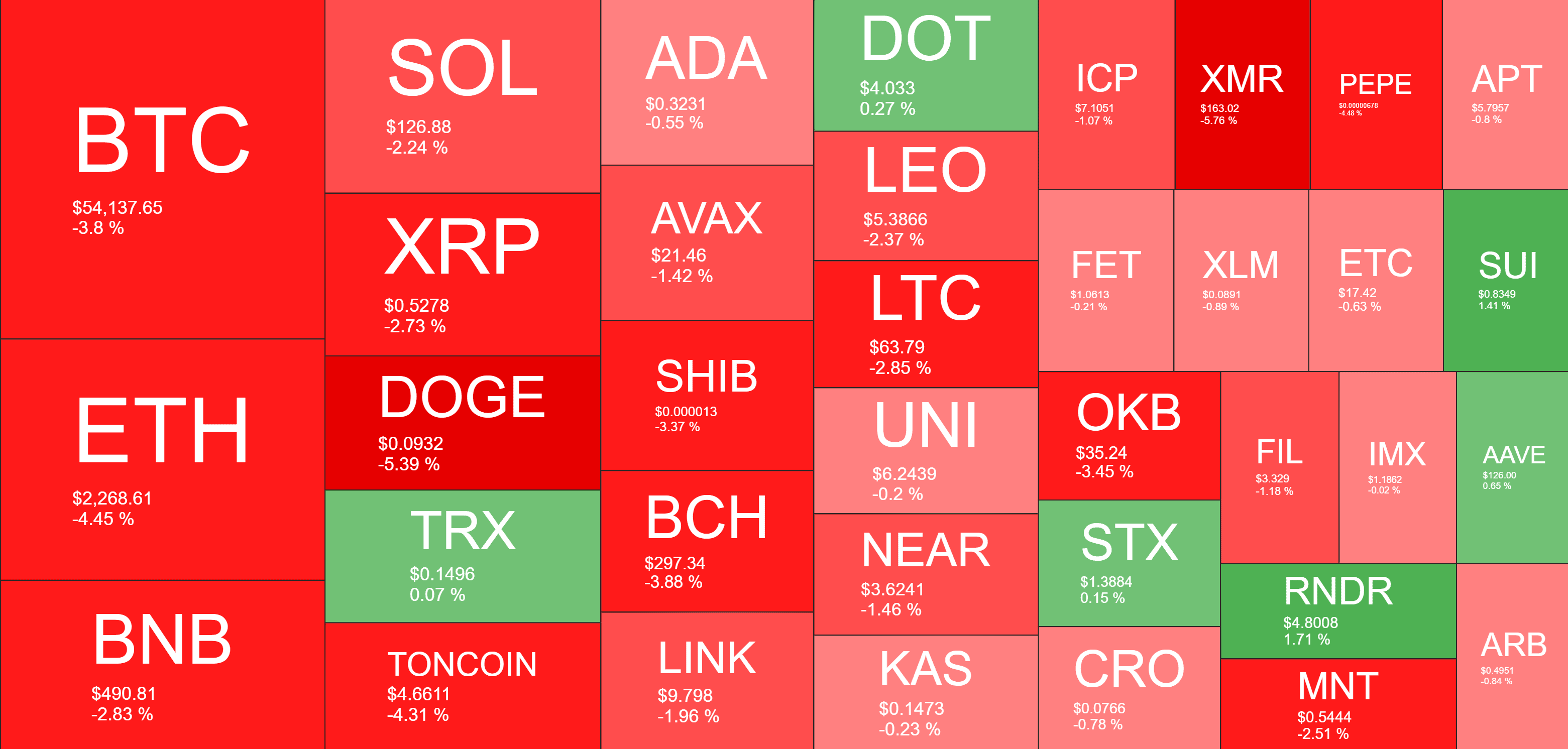 在过去24小时内,比特币继续呈现暴跌态势,价格从日内高点57,000美元在数小时内跌至53,000美元以下。与此同时,山寨币也普遍下跌,加密货币市场总市值一个月来首次跌破2万亿美元。