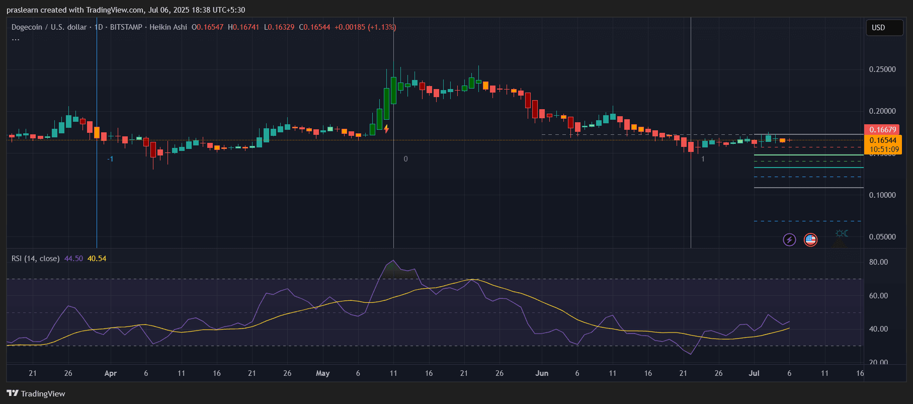 狗狗币日线呈现典型挤压形态。若买方推动价格突破0.17美元且RSI站上50,短期内升向0.20-0.23美元区间可期。反之若空头压制跌破0.15美元,则可能下探0.13美元甚至0.10美元才能获得强支撑。