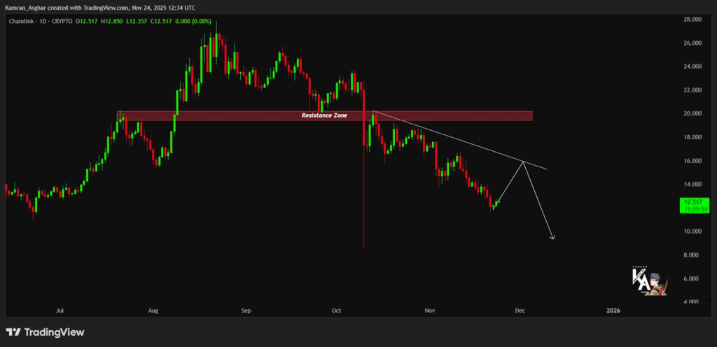 Kamran Asghar指出,“$LINK正在主动突破其整理形态。12.50美元的底部支撑已被击穿。”其图表显示价格可能在继续走低前重新测试趋势线。