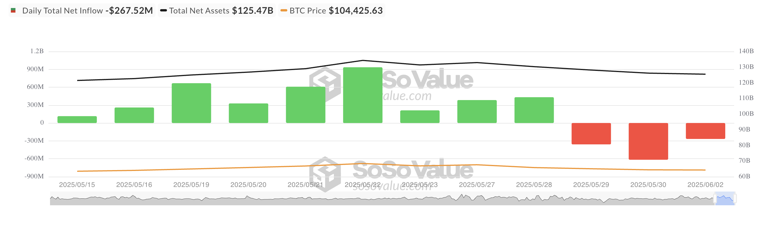 过去一周,比特币维持在105,000美元附近窄幅震荡,导致ETF活动明显放缓。周一,美国上市的现货比特币ETF资金流出超过2.5亿美元,这是连续第三个交易日出现资金外流。这表明随着比特币持续处于盘整阶段,机构投资者的兴趣可能正在减弱。