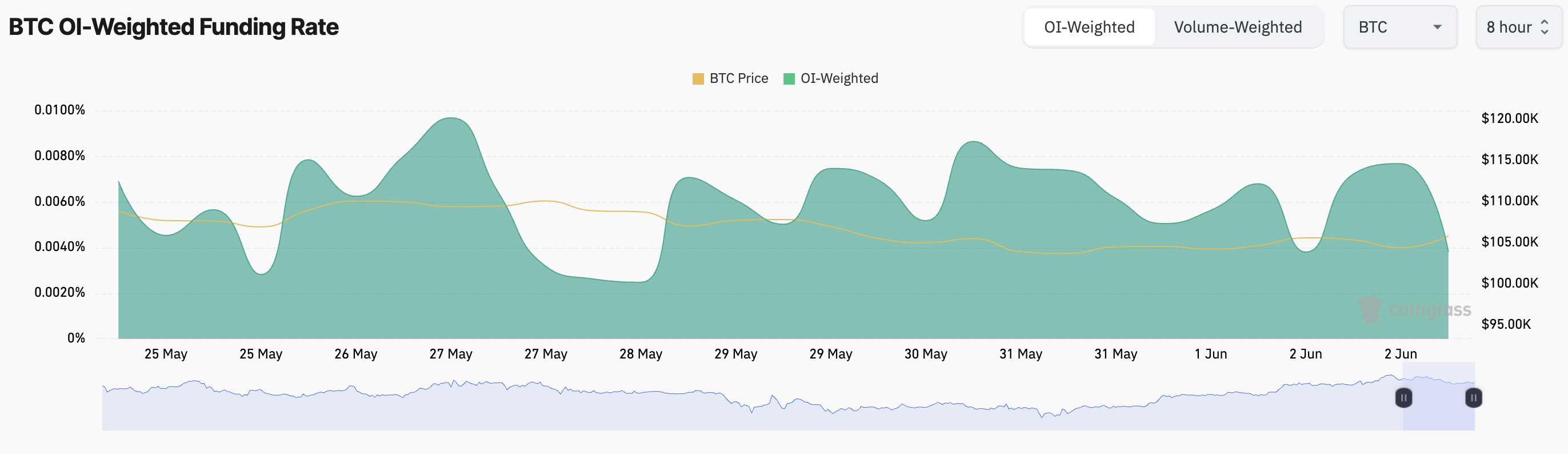 截至发稿,比特币报105,422美元,日内上涨1%。市场仍普遍存在看涨情绪,交易者持续押注行情将延续。这一预期通过永续合约0.0038%的正资金费率得到印证