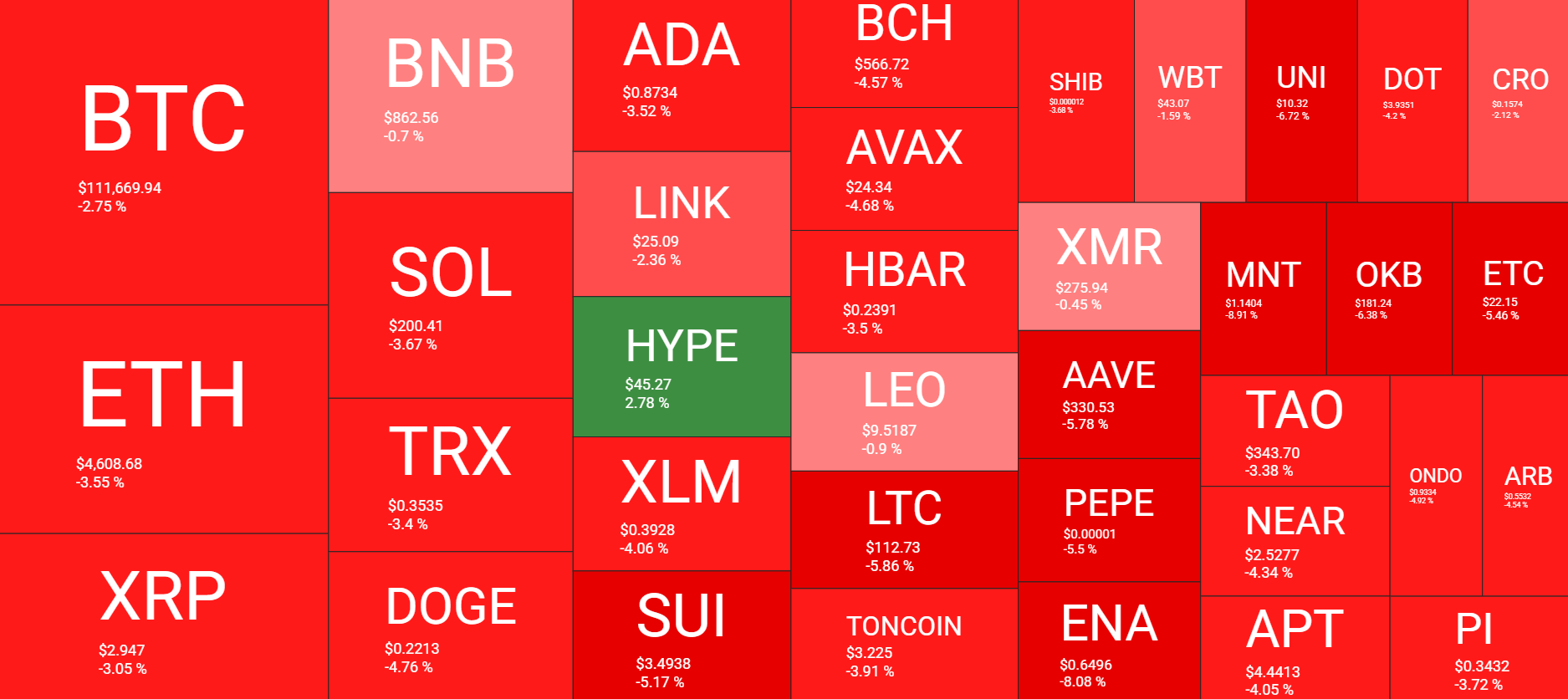 周日夜间风云突变,比特币价格意外暴跌数千美元,跌破111,000关口,创7月10日以来新低。虽一度反弹至113,000美元上方,但截至发稿时空头已重新掌控局面,价格回落至112,000美元下方。其市值缩水至2.225万亿美元,在CoinGecko上的山寨币主导率略超56%。