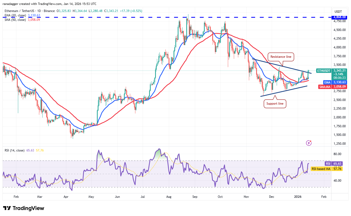 空头将尝试将价格拉回三角形内部,但如果多头成功守住阻力线,ETH/USDT交易对可能上涨至3,659美元,进而挑战4,000美元。