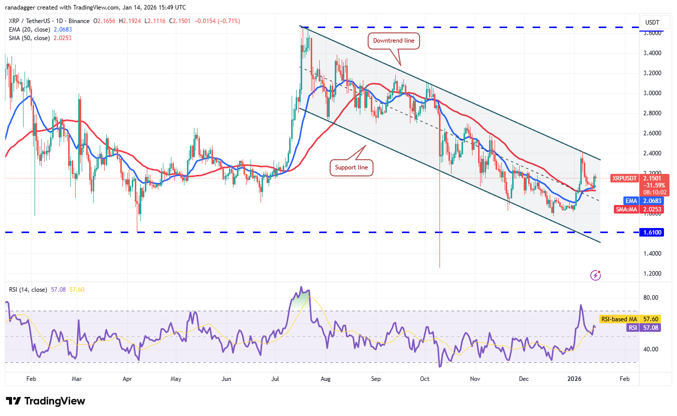 上行的20日指数移动平均线(2.06美元)以及处于积极区域的RSI表明多头占优。这增加了突破下降趋势线的可能性,预示着潜在的趋势转变。随后,XRP/USDT交易对可能上涨至2.70美元。