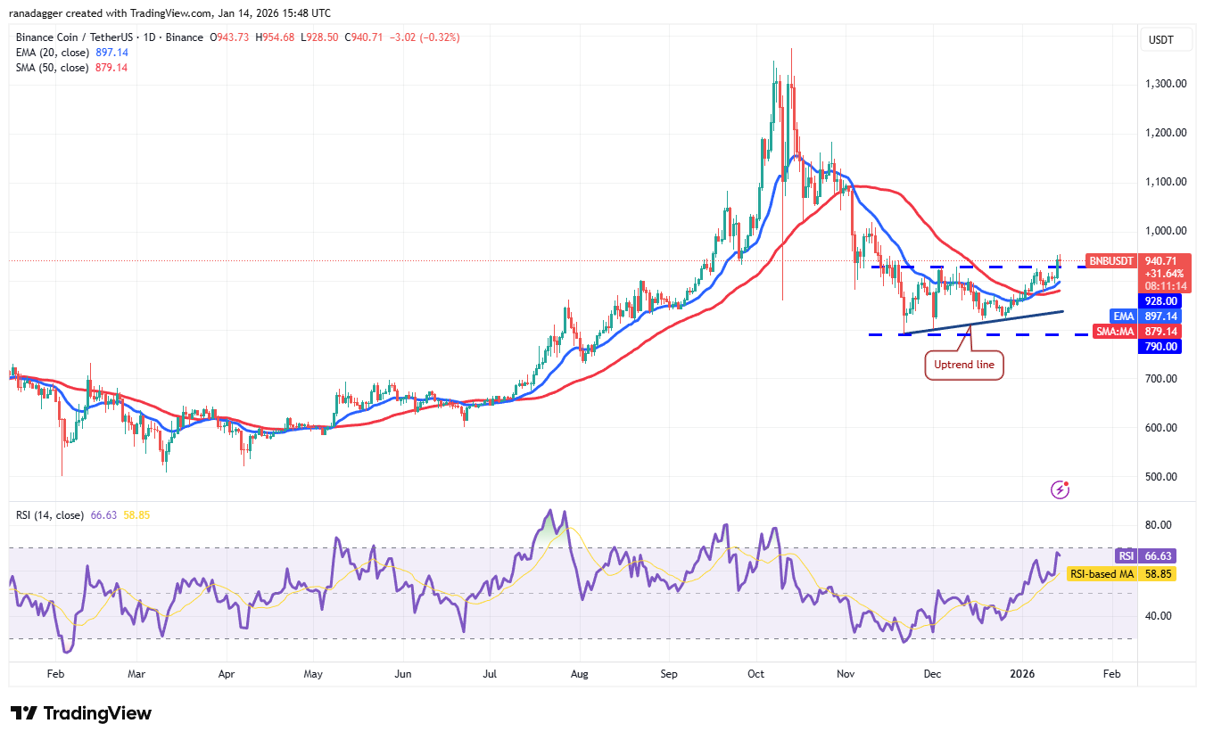 空头将试图通过将币安币价格拉至移动平均线下方来困住激进的多头。如果他们成功做到这一点,BNB/USDT交易对可能跌至上升趋势线,然后下探790美元。