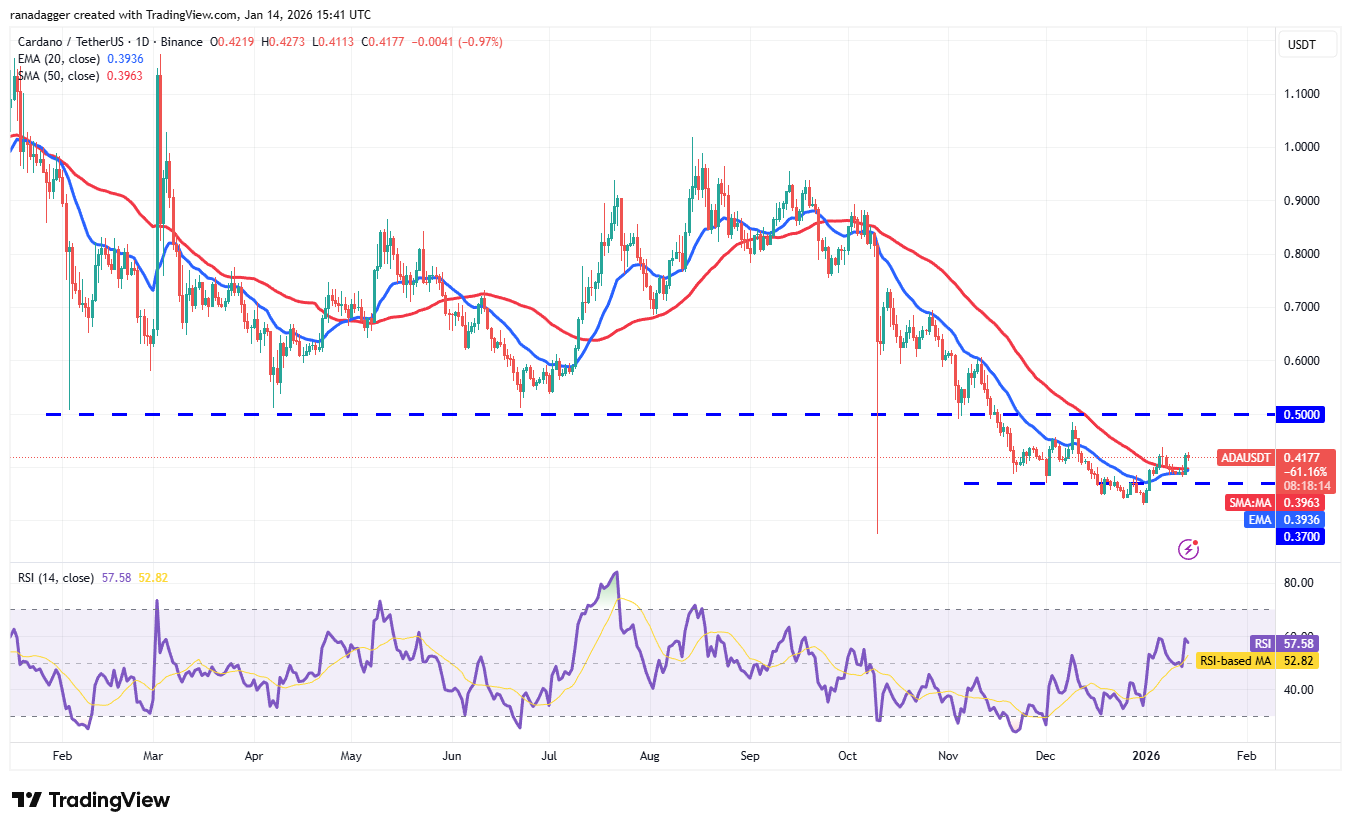买家在卡尔达诺中成功守住了20日EMA(0.39美元),表明市场情绪积极。