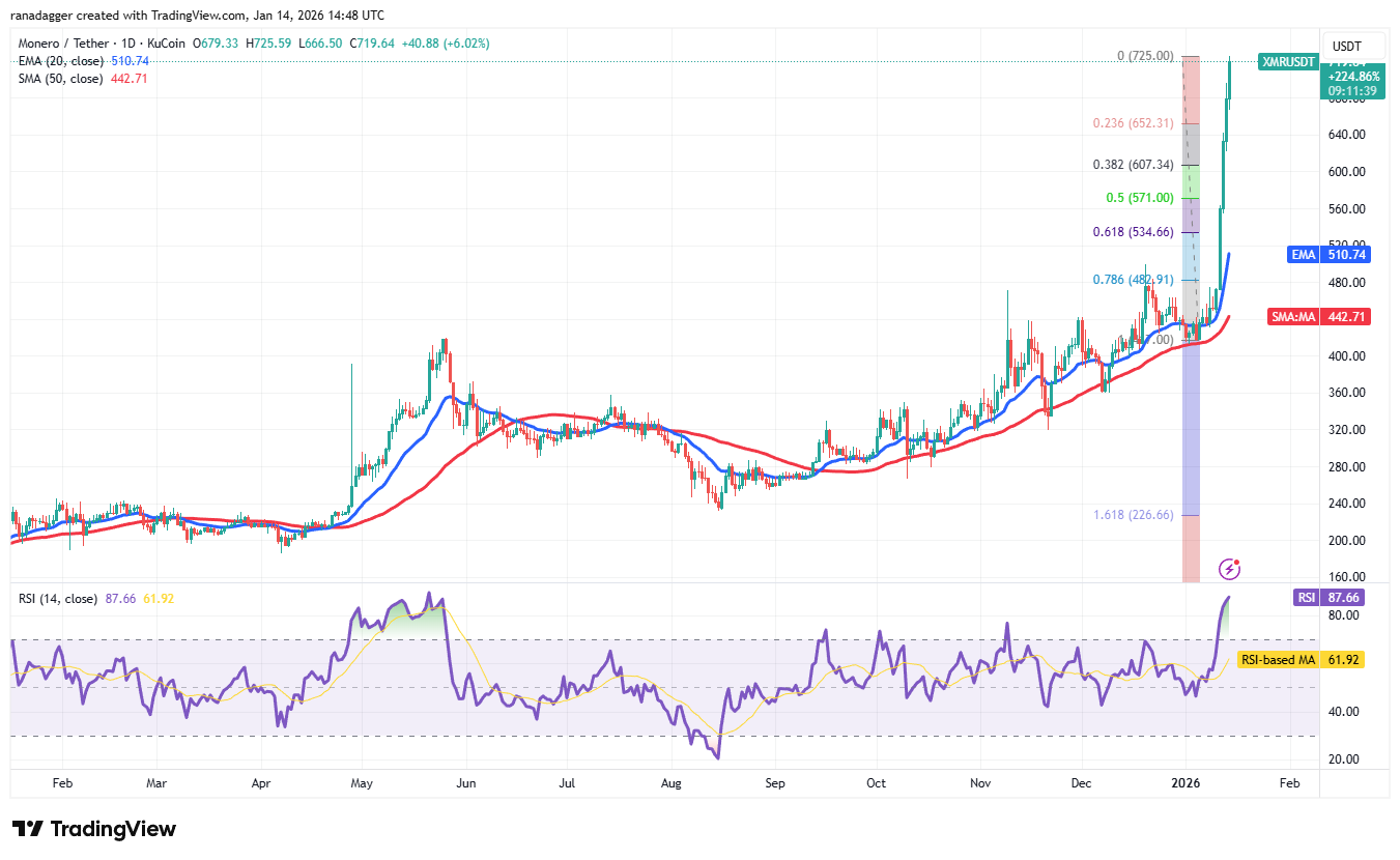 任何回调整理预计会在607美元的38.2%斐波那契回撤位找到支撑。浅度回调增加了上涨趋势延续的可能性。随后,门罗币价格可能飙升至915美元。若收盘价低于571美元的50%回撤位,则看涨势头预计将减弱。