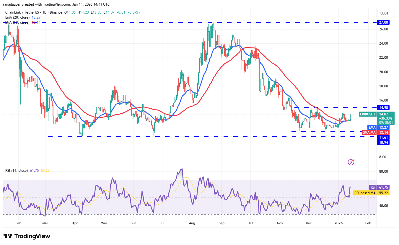 多头将尝试通过将Chainlink价格推高至14.98美元阻力位上方来巩固其地位。如果他们成功,LINK/USDT交易对可能上涨至17.66美元。这将使较大的10.94美元至27美元区间发挥作用。