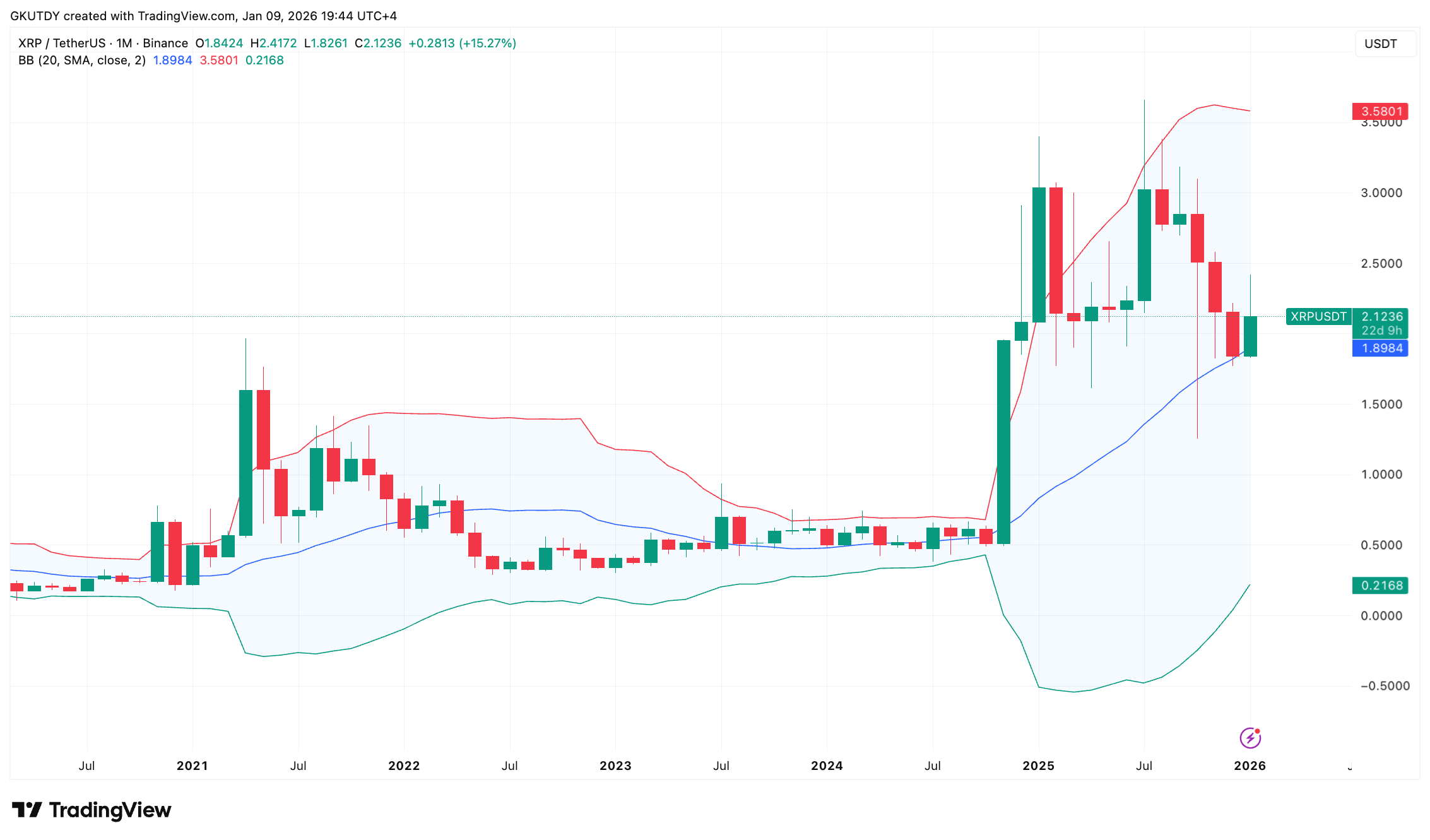 瑞波币可能正面临10%的下跌,但这种价格回调并不足以终结牛市行情。从TradingView的月度布林带结构来看,这更像是一次技术性洗盘,旨在为下一轮上涨清除风险。