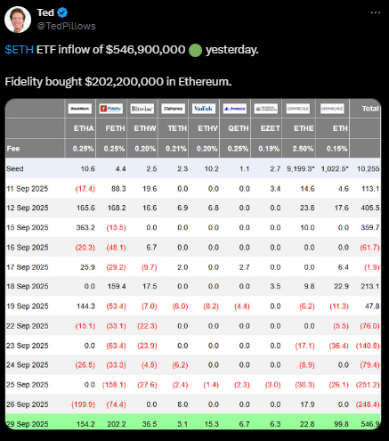 5.46亿美元涌入ETH ETF,富达领跑 | 来源:Ted Pillows,X