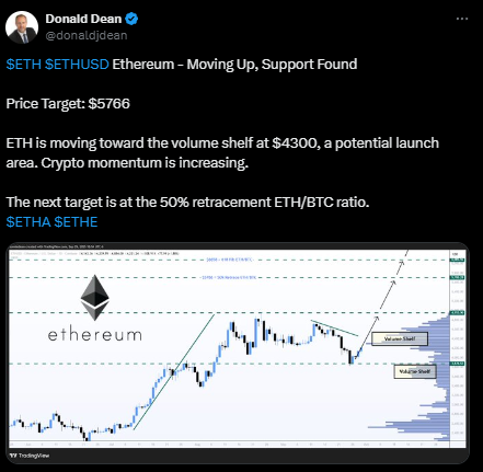 $ETH正向5766美元目标迈进 | 来源:Donald Dean,X
