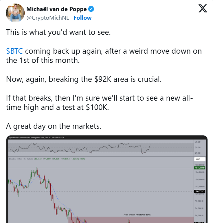 Michael van de Poppe认为比特币突破93,000美元至关重要。他指出若比特币能守住这一关键价位之上的涨幅,则可能向10万美元迈进。