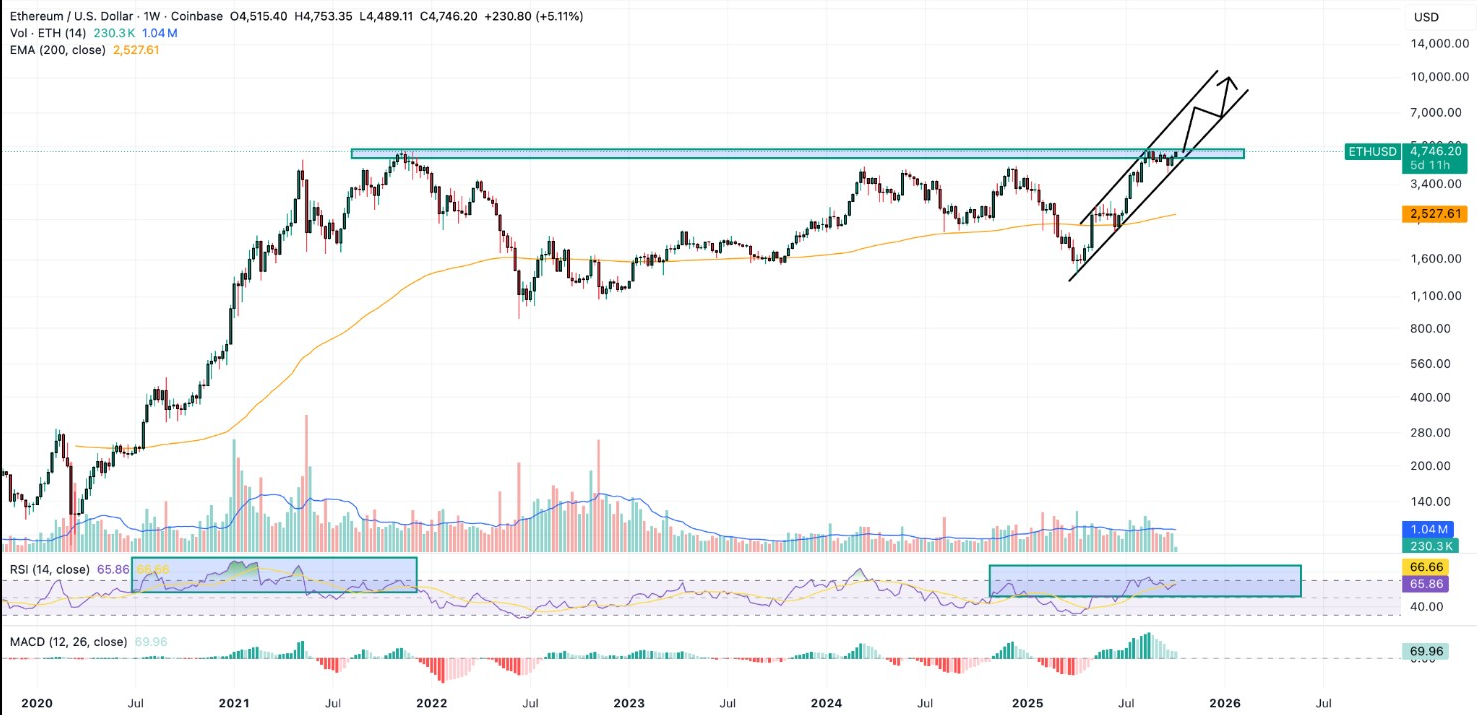 以太坊(ETH)持续领涨,突破4700美元后保持上涨动能,向市场期待已久的1万美元目标迈进。分析师将这一涨势归因于以太坊相关ETF创纪录的资金流入,以及降息预期下美元走弱的影响。