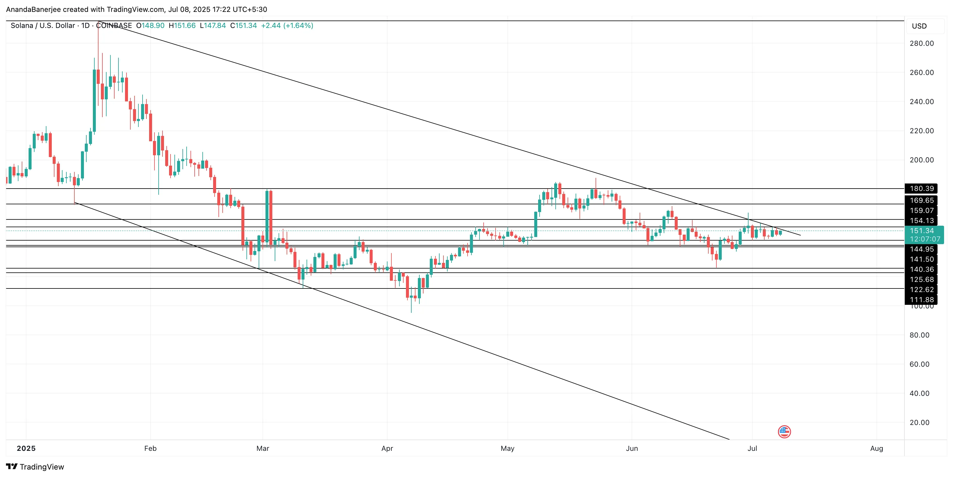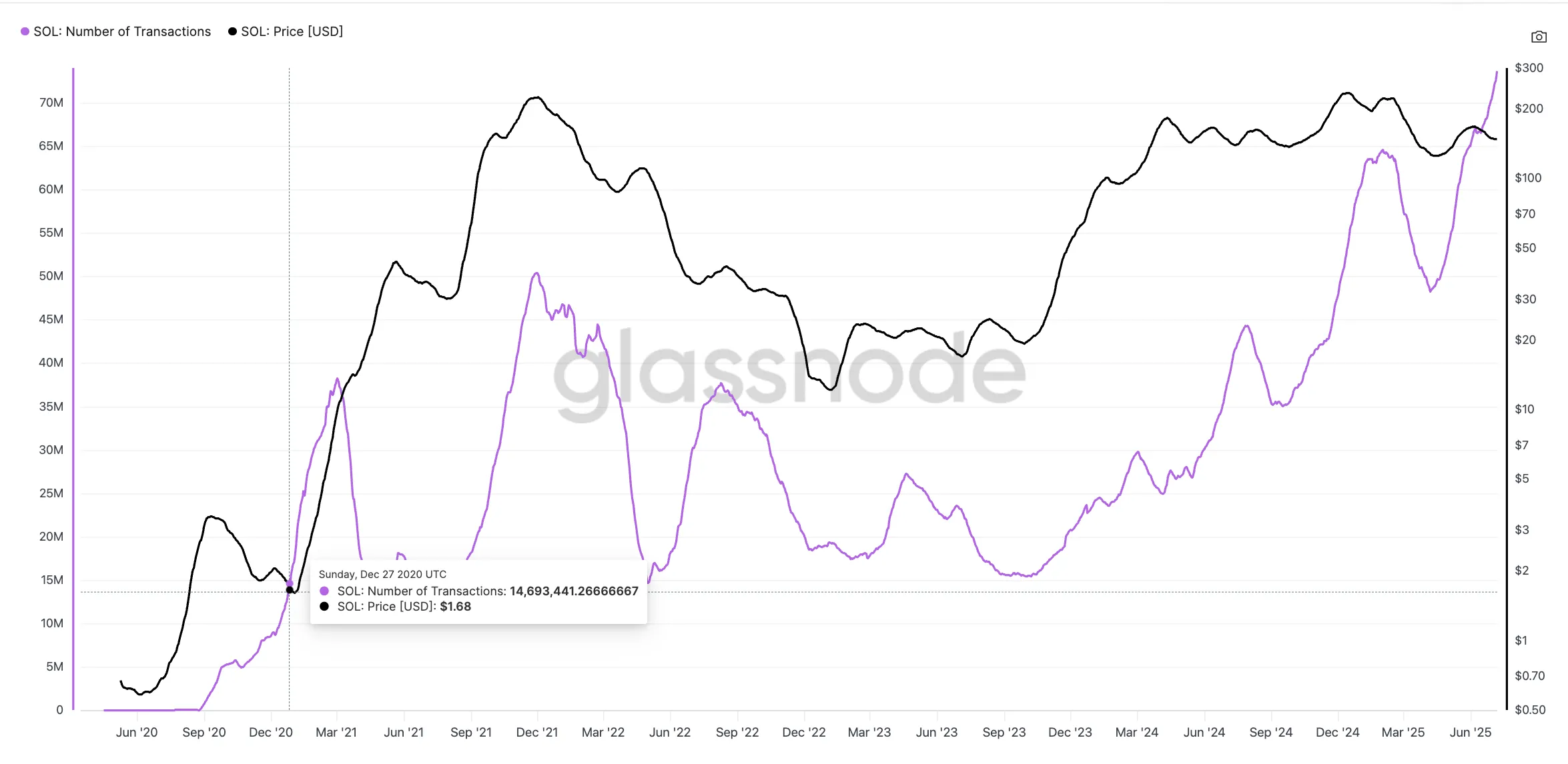 Solana网络交易量已突破7000万笔,但更值得注意的是图表揭示的规律:上一次交易量线突破价格线时,随之而来的是持续数年的价格飙升。如今在2025年7月,相似交叉再次出现,但价格仍徘徊在151美元左右未见起色。