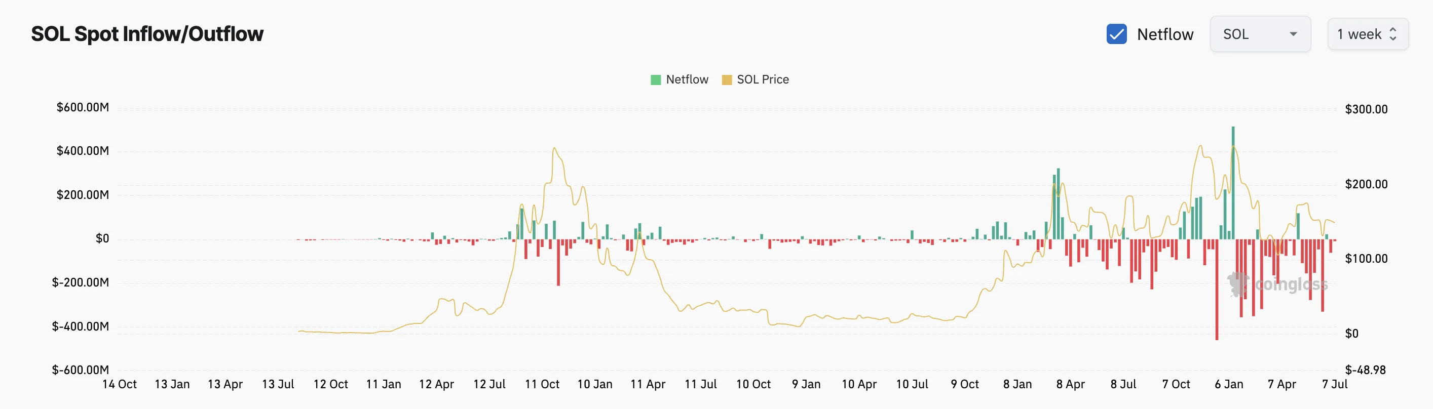 Coinglass数据显示Solana持续出现资金外流,这种情况通常暗示着筹码积累。不过近期外流速度已放缓,同时也没有出现资金涌入的高峰。简言之,当前市场既没有大规模抛售SOL,也没有出现抢购热潮。这种微妙平衡或许解释了价格滞后的原因——交易者似乎在等待更明确信号才会选择方向。