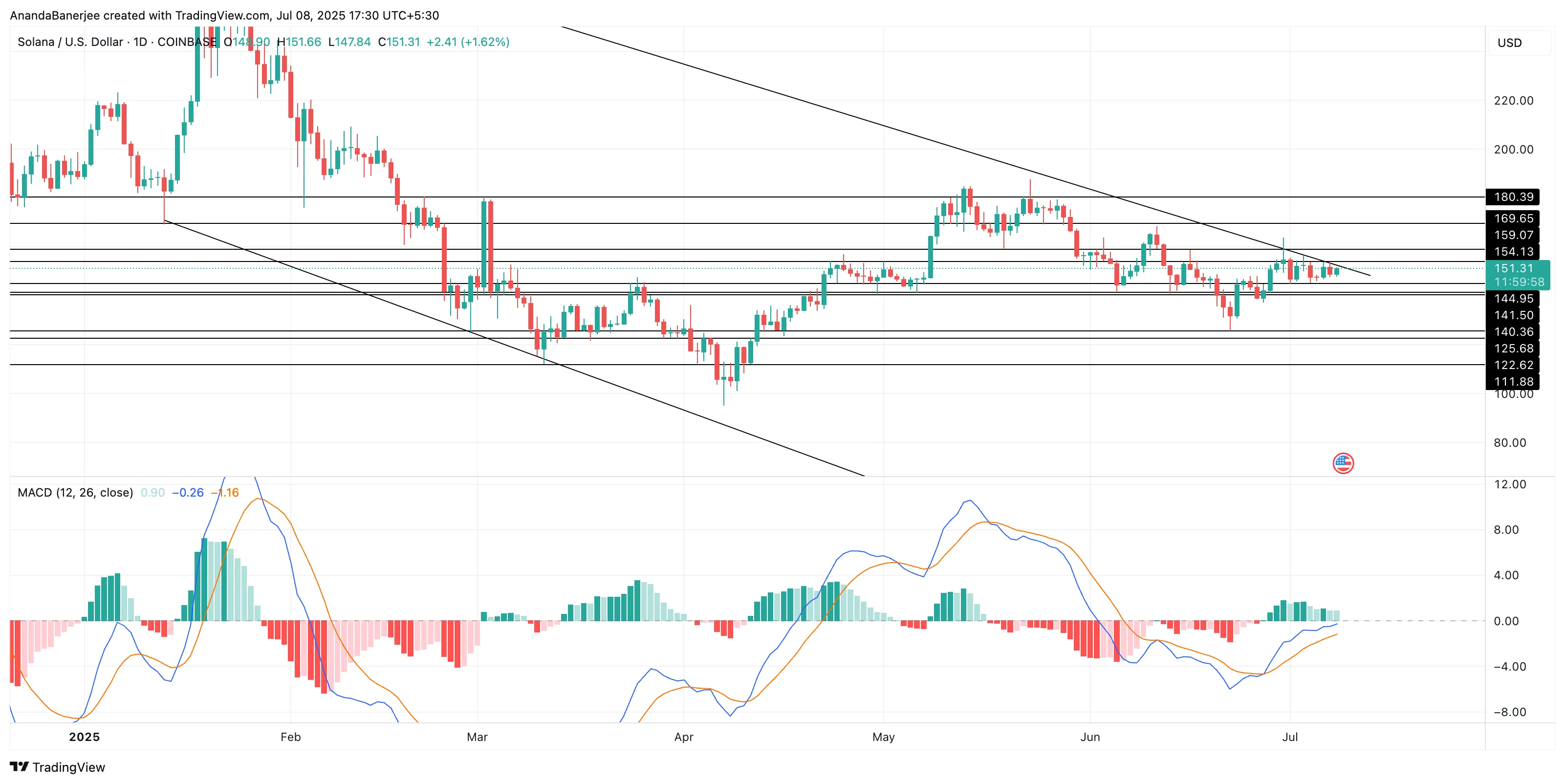 自2025年1月以来,SOL价格始终运行于大型下降楔形内。该结构至今保持完整,但价格已多次测试155美元的上轨阻力而未果。若有效突破155美元,169美元和180美元将成为后续关键阻力位;反之若突破失败,可能回落至140-125美元的原有震荡区间。需特别注意125美元是多头最后防线,一旦失守将导致技术形态失效。