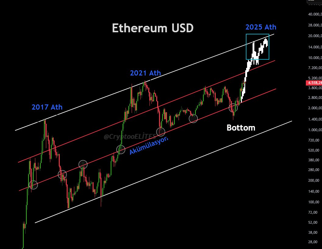 CryptoELlTES发布的跨周期图表显示,ETH在2017和2021年牛市顶峰均触及上升通道上沿,而周期低点则沿通道下沿形成。值得注意的是,ETH近期从通道下沿反弹并重回主通道,若历史重演,2025年可能冲击通道上沿15000-20000美元区间。