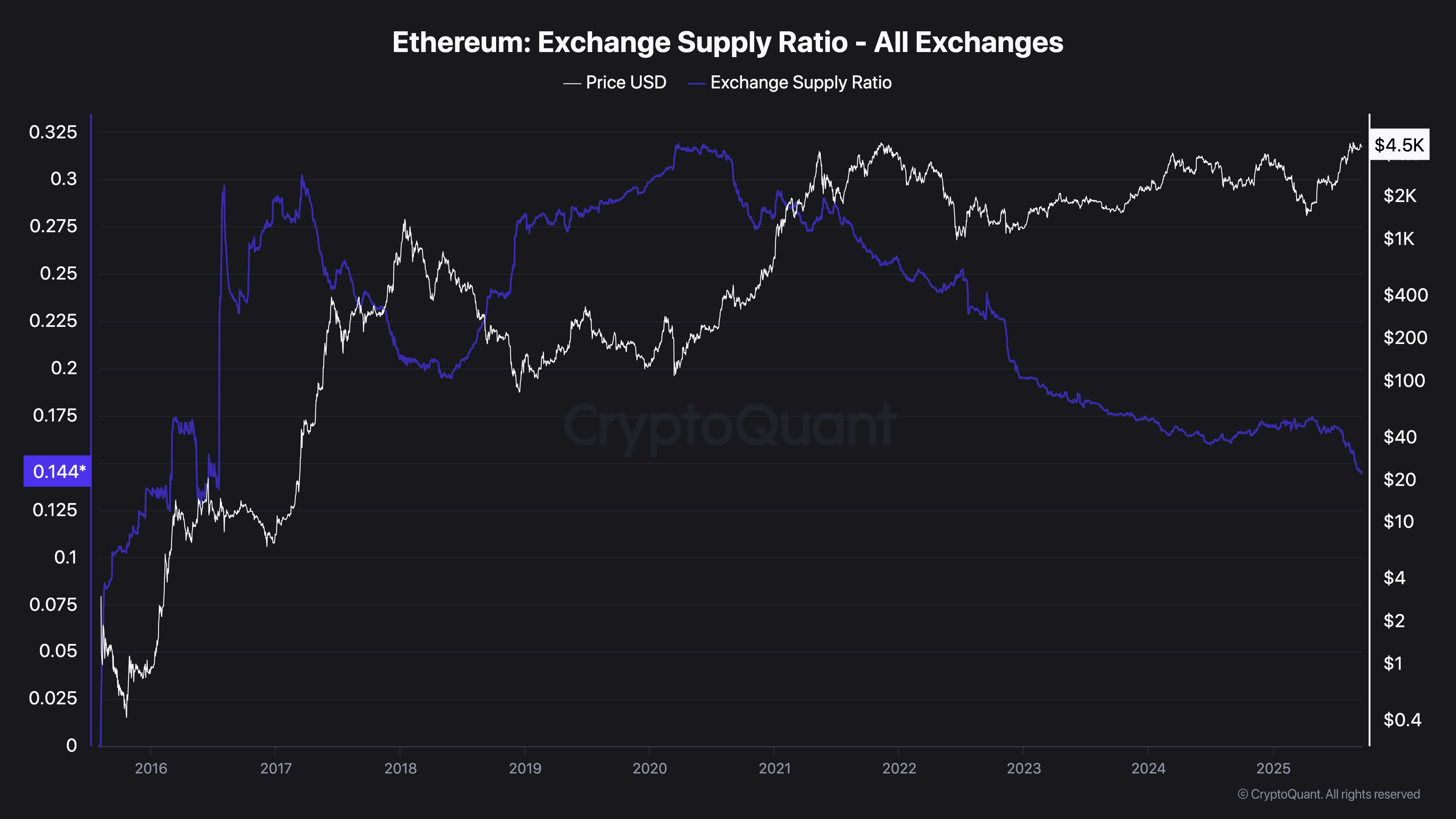CryptoQuant数据显示,交易所ETH持仓占比自2020年持续下降,交易所供应比率从0.30降至今年0.14。历史周期中该比率与市场峰值高度相关,当前周期创纪录的低值表明交易所供应减少,更多ETH进入长期存储。