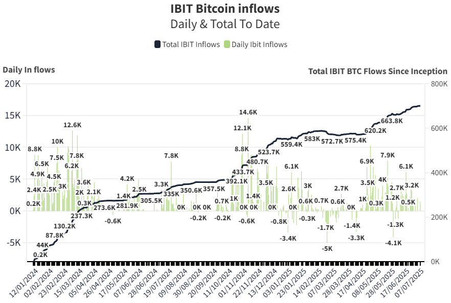 其旗下的iShares比特币信托基金(IBIT)目前已累计持有超过70万枚BTC,总价值突破750亿美元。仅周一单日流入量就超过1.6亿美元,凸显出今年机构投资者持续加速积累的态势。