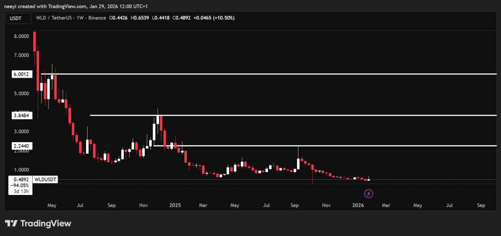 截至撰稿时,Worldcoin(WLD)价格徘徊在0.5美元左右。这一水平反映了数月来持续的下行压力,该代币较2024年中的高点已下跌约95%。这样的背景让问题变得简单而实际:如果情况好转,如今投入WLD的1000美元到2027年可能价值几何?