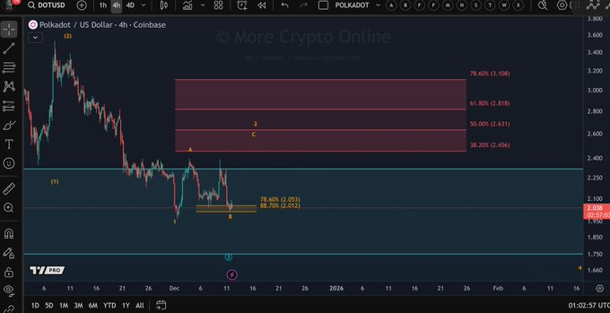有分析指出DOT“仍可能尝试构筑更宽泛的2浪”,只要价格维持在12月低点上方,这一可能性就依然存在。目前市场再次进入2.01-2.05美元的关键区间,该区域靠近78.6%与88.7%斐波那契回撤位,形成当前决策区域。