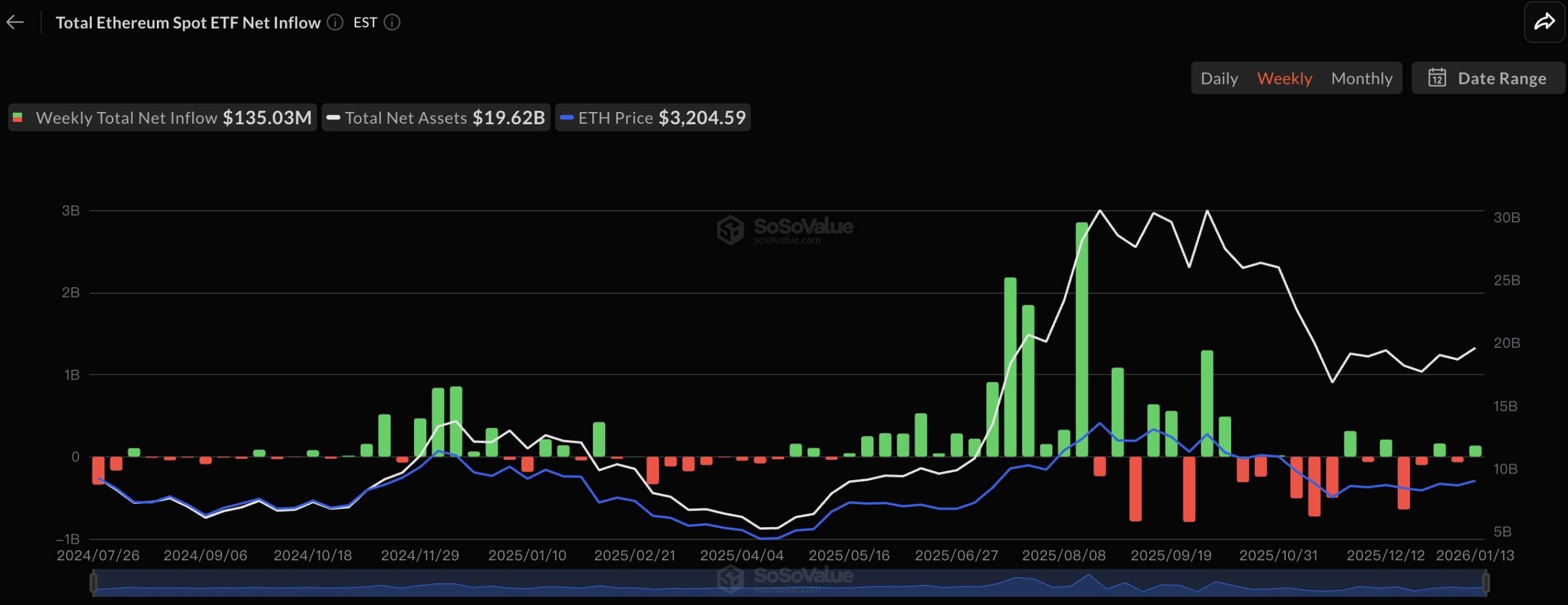 近期资金流的反弹并不仅限于比特币。以太币也表现强劲,本周早些时候一度飙升7%,年内涨幅达到13%。与此同时,以太坊现货ETF单日录得1.3亿美元的净流入,尽管其周度总流入量仍相对温和。