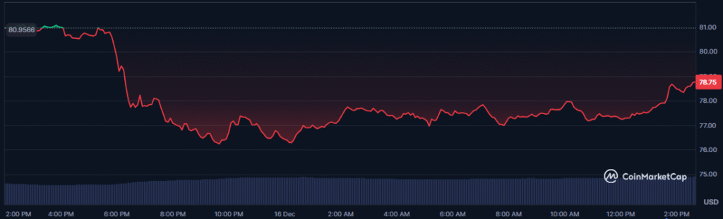 过去几日莱特币经历显著价格调整。在12月10日触及84.63美元的38.2%斐波那契回撤位受阻后,该加密货币连续走出六根日线阴线,跌幅达9%。截至发稿时,莱特币交易价格正试探77.19美元的关键支撑位。由于始终未能突破84.63美元的阻力位,目前正在重新测试支撑水平以确认下跌趋势是否会延续。