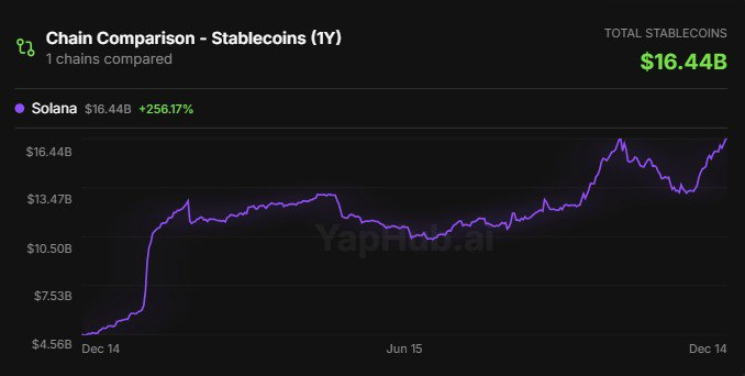 Solana链上经济持续扩张,其网络稳定币供应量已飙升至164.4亿美元的历史新高,同比增幅超过256%。这一显著增长反映出市场对Solana生态系统中结算速度、低费用和流动性的需求正在持续增长。