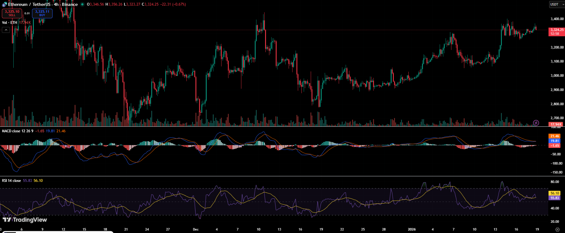 与此同时,ETH似乎在3300美元区域附近构筑了双重底部形态,强化了买方反复在该水平介入的观点。动量指标进一步支持了谨慎看涨的叙事。在4小时时间框架上,MACD已转头向上,暗示下行动量正在消退,短期趋势转变可能正在酝酿。虽不能单独作为突破确认,但这常是市场情绪改善的早期信号。