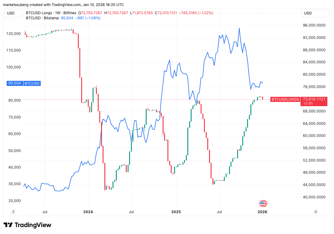 评论员MartyParty在上周六关于此主题的一篇帖子中指出:“Bitfinex的巨鲸正在激进地关闭BTC多头,这一信号在历史上预示着巨大波动即将来临。”“上次这种‘平仓’发生在2025年初,当时比特币正停滞在7.4万美元。”