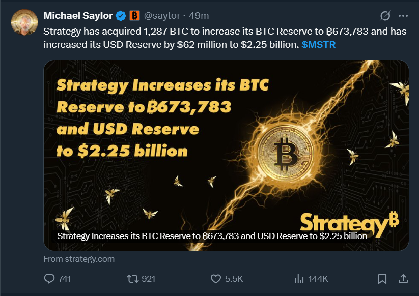 迈克尔·塞勒的Strategy(MSTR)购入1,287枚比特币
