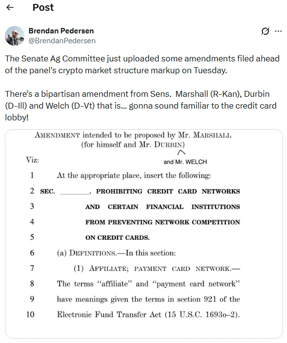 布伦丹·彼得森于1月24日报道了该文件的提交并公开分享了修正案内容。他指出,该条款对信用卡游说团体来说会非常耳熟。