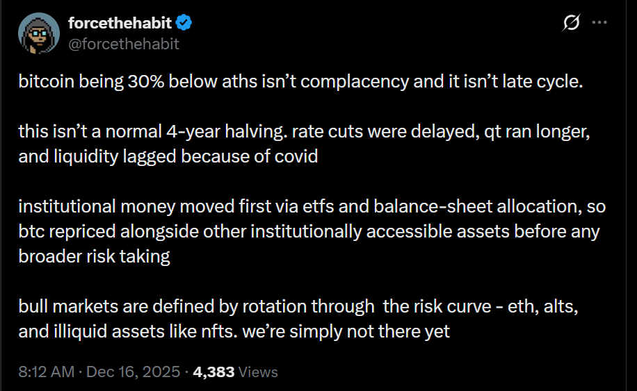 据X用户“forcethehabit”分析,比特币下跌并不代表趋势转变,因为降息进程推迟且美联储缩减资产负债表的时间长于预期。该分析同时指出,机构资金主要通过ETF和企业储备进入市场,而向高风险低流动性资产的轮动尚未实现。