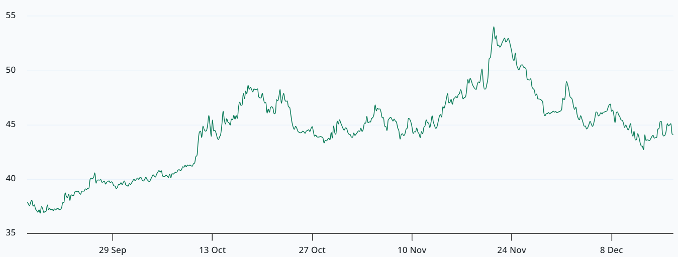 比特币期权隐含波动率在11月触及53%峰值,与特斯拉当前水平基本持平。当交易者预期价格剧烈波动时,该指标会因看涨/看跌期权权利金上涨而抬升。做市商往往在意外价格波动概率升高时降低风险敞口,但这未必意味着投资者转为看空。