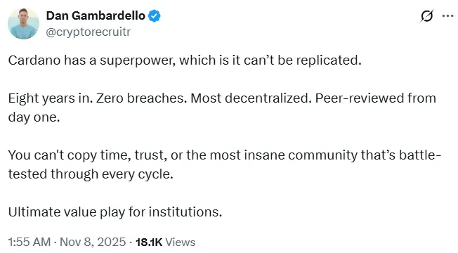 她特别指出:卡尔达诺多年保持零链中断记录,其治理模型和透明代码符合监管预期。值得注意的是,ADA已被纳入灰度数字大盘基金,为机构投资者提供合规敞口。Linda预测新一轮市场周期将由机构主导,养老基金等长期资本入场时,将优先选择具备稳定记录的项目。