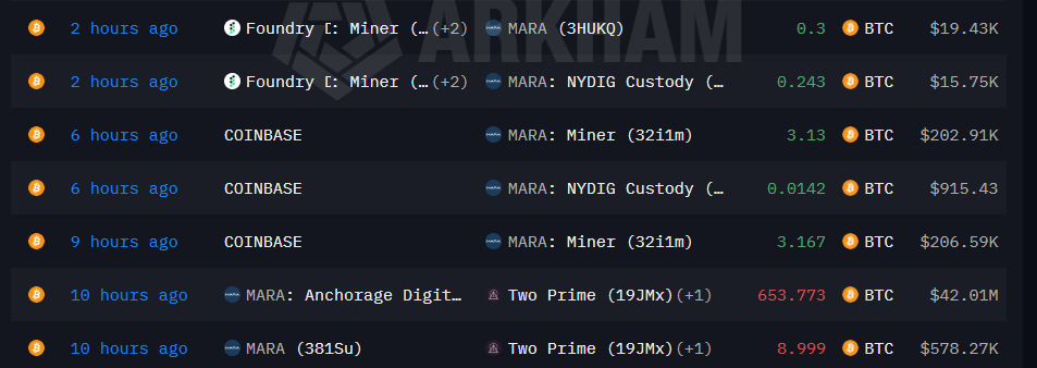 根据Arkham Intel的区块链数据分析,MARA Holdings向Two Prime转移了最大笔比特币:约653.773枚(价值4200万美元),随后在10小时前再次转移约8.999枚(价值约57.827万美元)。