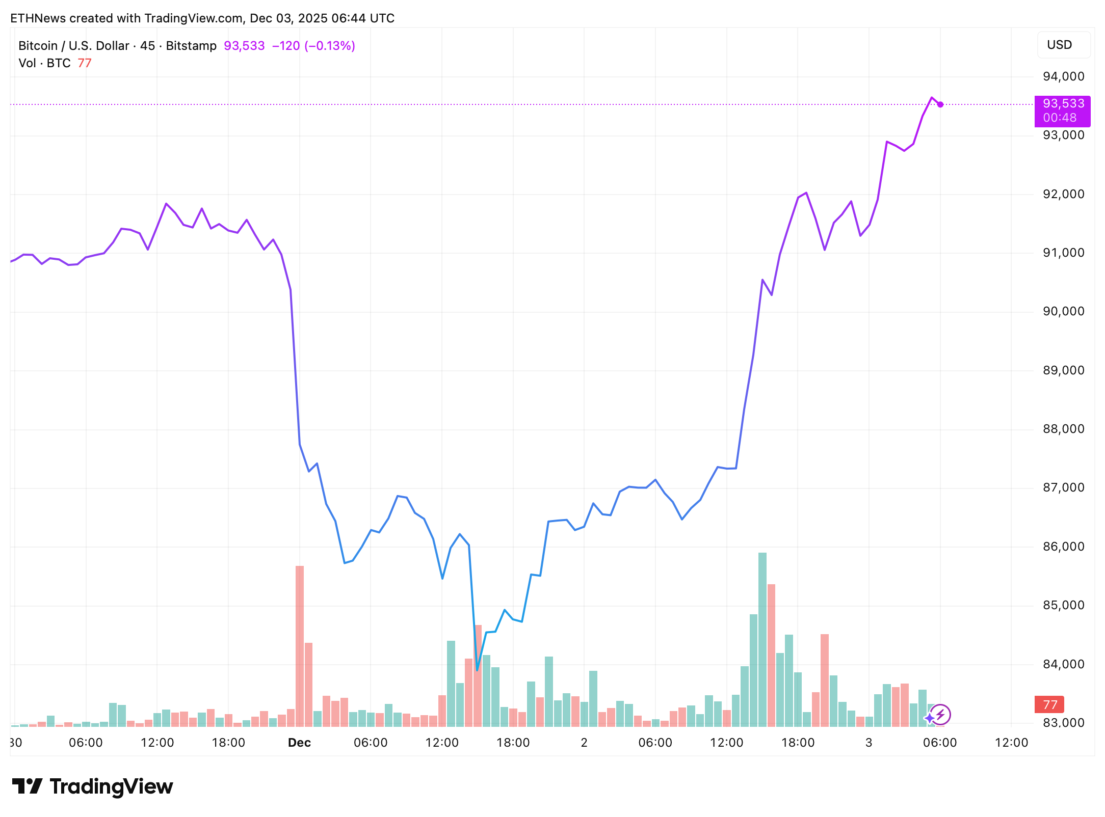 技术图表表明比特币已实现对93000美元关键点位的决定性突破,该位置此前构成强劲阻力。突破行情得到多项走强动能指标支撑:价格收复本周初形成的短期下跌趋势结构;MACD和RSI等动量指标发出看涨转向信号,确认了11月下旬主导市场的抛压已发生转变;上涨过程中成交量显著放大,表明这是由市场坚定信念推动的反弹,而非空头回补带来的短暂回升。