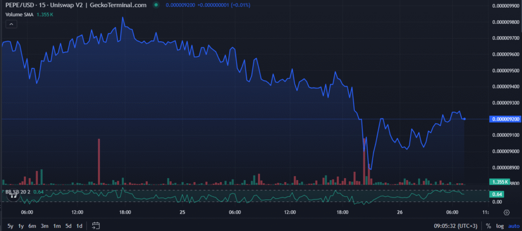 15分钟图显示PEPE从0.00000900美元下方反弹至0.00000920美元附近,表明市场在剧烈抛售后尝试恢复平衡。