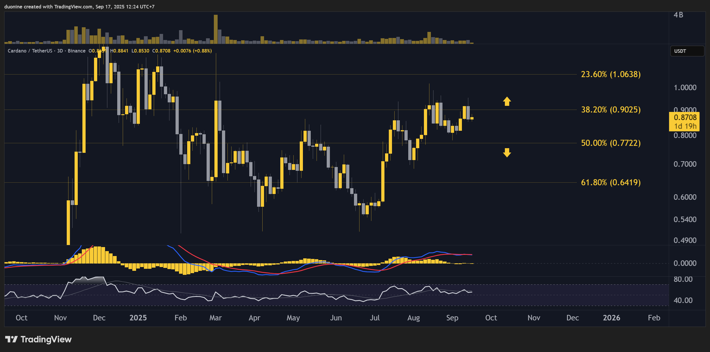 本周ADA尝试突破0.9美元阻力位未果,目前价格在这一关键点位下方徘徊。此次突破失败可视为看跌信号,可能促使卖家将价格打压至0.77美元支撑位。
