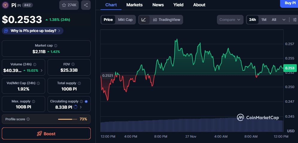 Pi市值超过21亿美元,走势与每日小幅价格上涨保持一致。流通供应量远低于总供应量,这在市值与长期估值之间形成巨大差距。这种结构凸显出未来代币分配阶段可能对资产长期方向产生的影响。