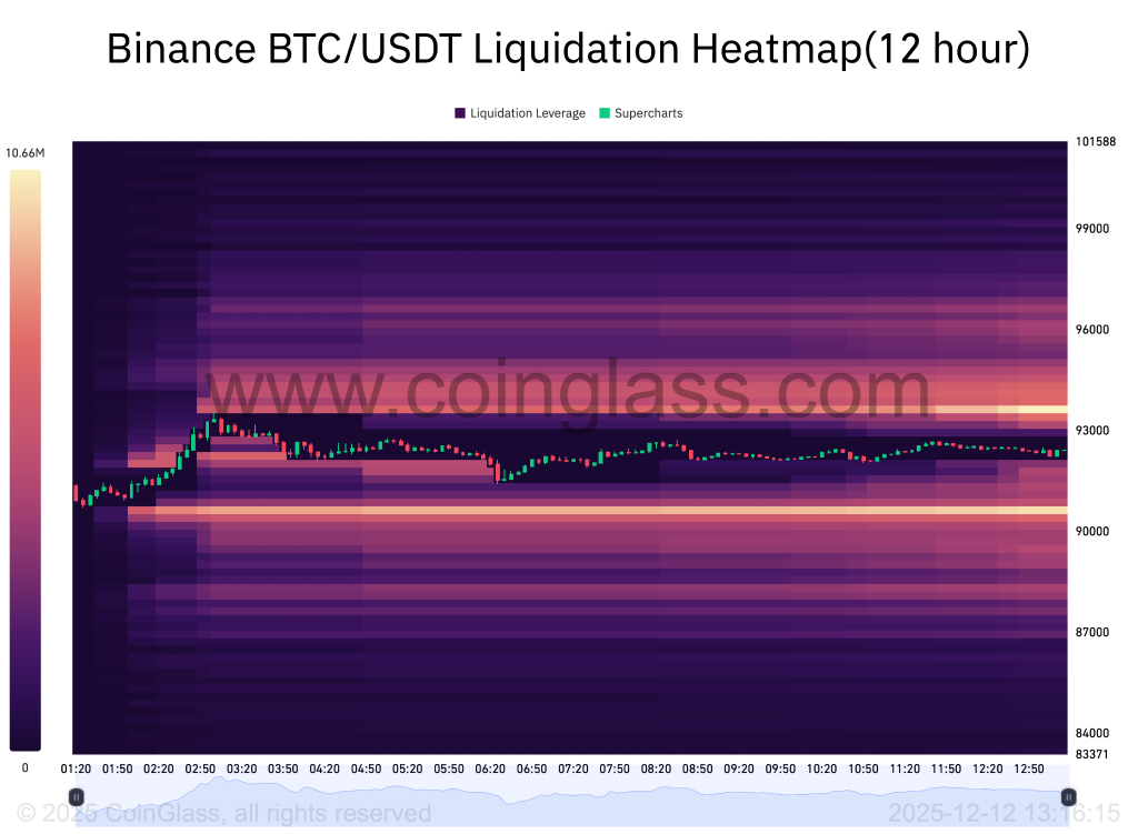 比特币价格在过去一天内呈现出明显收窄的震荡区间,在未能延续周初突破95,000美元的涨势后,始终在92,500至93,800美元之间徘徊。市场动能有所减弱,波动率持续收缩,日内走势渐趋平淡——这种形态往往预示着市场正在等待催化剂。但在平静的表象之下,热力图数据揭示了更为活跃的内幕:资金正在价格两侧悄然积聚。而这种格局很少意味着中性平衡,不禁让人好奇后续可能出现的变盘。