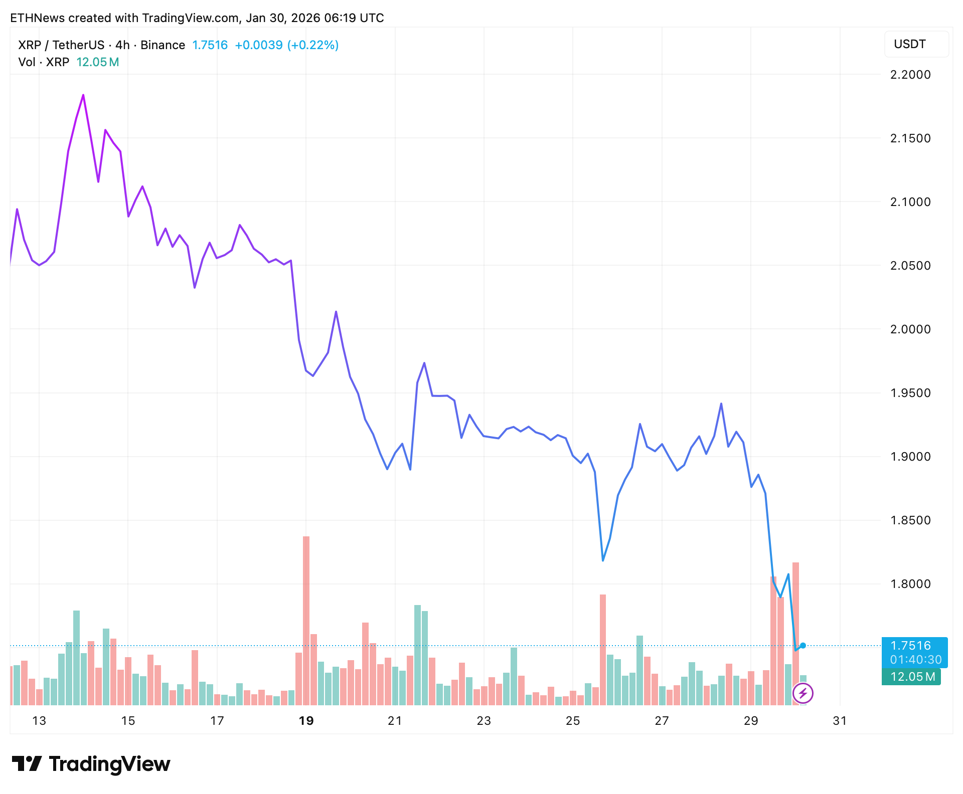 过去24小时内,XRP延续下行趋势,随着关键技术支撑位失守,价格从1.88美元附近下跌约7%至1.75美元。抛售行情迅速展开,伴随成交量急剧放大,表明市场存在强制平仓行为而非有序获利了结。截至尾盘,价格走势趋于稳定,但技术面破位影响尚未消除。